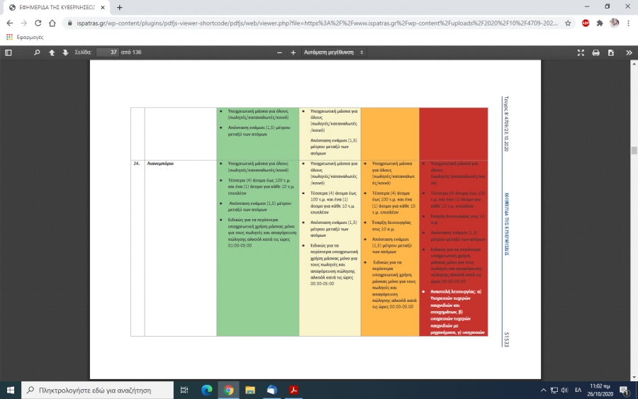 Για τη Λάρισα όπως και για όλες της περιοχές της Ελλάδας που έχουν υπεισέλθει στο επίπεδο υψηλού επιδημιολογικού φορτίου (πορτοκαλί), της Υπουργικής Απόφασης Δ1α/Γ.Π.οικ. 64450/11-10-2020, οι υποχρεώσεις των καταστημάτων λιανικού εμπορίου, και για όσο είναι στο πορτοκαλί επίπεδο, με βάση το ΦΕΚ 4709/23-10-20 είναι οι εξής: