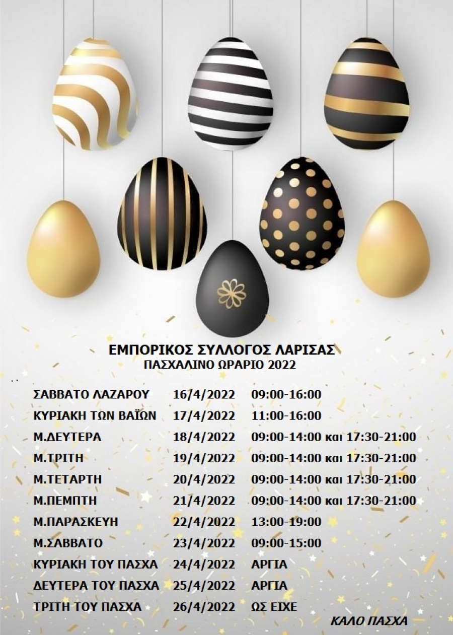 Ο Εμπορικός Σύλλογος Λάρισας, ανακοινώνει το προτεινόμενο ωράριο λειτουργίας των εμπορικών καταστημάτων της πόλης μας (κατά πλειοψηφία), που θα ισχύσει για την εορταστική περίοδο του Πάσχα 2022.