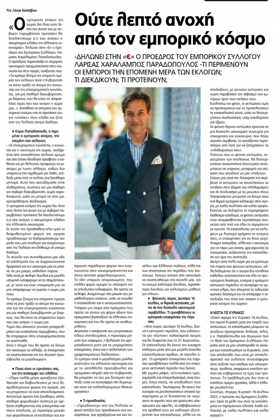 Όσον αφορά στην Κυριακή 16 Ιουλίου, την πρώτη Κυριακή μετά την έναρξη των εκπτώσεων, τα καταστήματα μπορούν να ανοίξουν προαιρετικά. Ωστόσο, η θέση του Εμπορικού Συλλόγου Λάρισας είναι να μην υποστηριχθεί το άνοιγμα των καταστημάτων τις Κυριακές γιατί έχει αποδειχθεί πως είναι μη αποτελεσματικές και ουδέποτε συνεισέφεραν στην αύξηση των εσόδων των επιχειρήσεων. Αντίθετα επιφέρουν επιπλέον κόστος και επιβαρύνουν τις τιμές των προϊόντων. Το πρόβλημά μας δεν είναι οι επιπλέον ημέρες εργασίας αλλά η έλλειψη ρευστότητας.