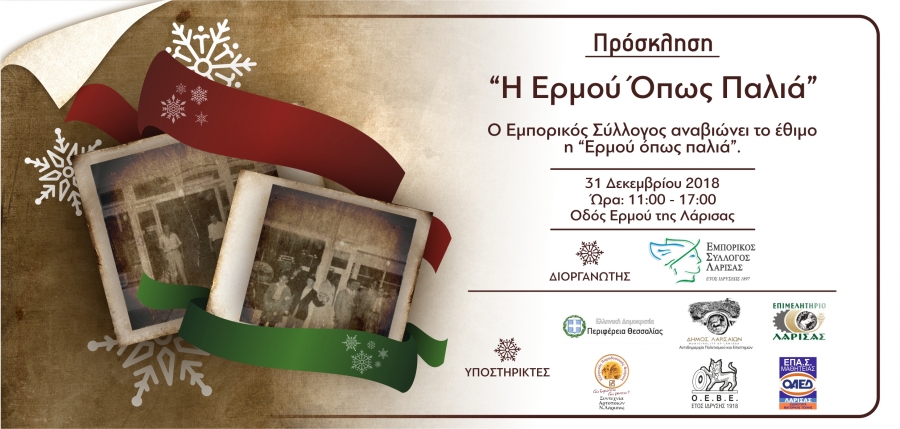Έτσι λοιπόν για δεύτερη φορά φέτος, ύστερα από πολλά χρόνια, ο Εμπορικός Σύλλογος Λάρισας καλεί τους Λαρισαίους να συμμετέχουν και να χαρούν με τις οικογένειές τους στη γιορτή «Η Ερμού όπως παλιά». Η γιορτή θα ξεκινήσει την παραμονή της Πρωτοχρονιάς στις 11:00 το πρωί και έως τις 17.00 το απόγευμα,πολύ μουσική, χορός, διασκέδαση, κεράσματα, διαγωνισμοί και πολλές εκπλήξεις θα πλημμυρίσουν την Ερμού.